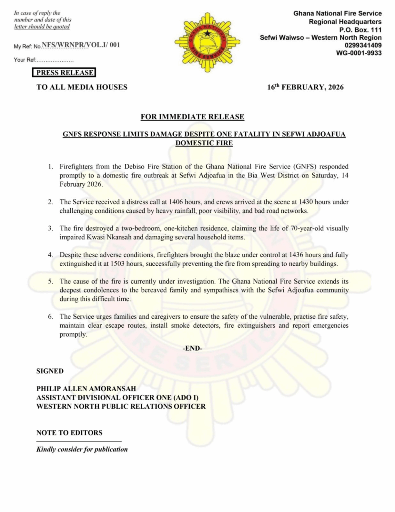 The Fire Service extended condolences to the family and the Sefwi Adjoafua community, urging residents to take precautions to protect vulnerable people. Recommended measures include maintaining clear escape routes, installing smoke detectors and fire extinguishers, and reporting emergencies promptly.