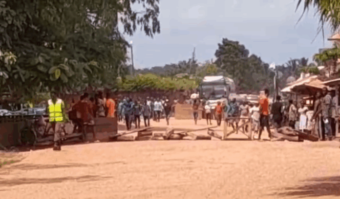 Tensions ran high in Samreboi as irate youth staged a roadblock leading to the Sarmatex Timber Company, protesting the recent arrest of illegal miners caught operating in a nearby forest reserve.