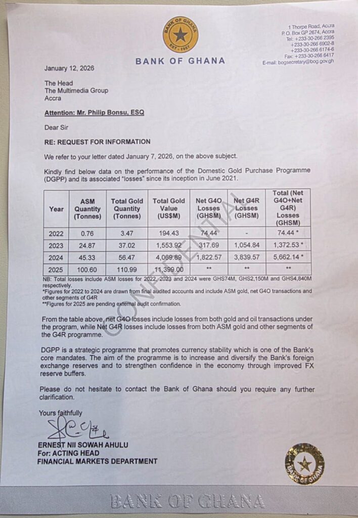 The Bank of Ghana (BoG) has confirmed that Ghana incurred substantial losses under the Domestic Gold Purchase Programme (DGPP) and its Gold-for-Reserves (G4R) framework in 2024, with total losses for the year amounting to GH¢5.662 billion.