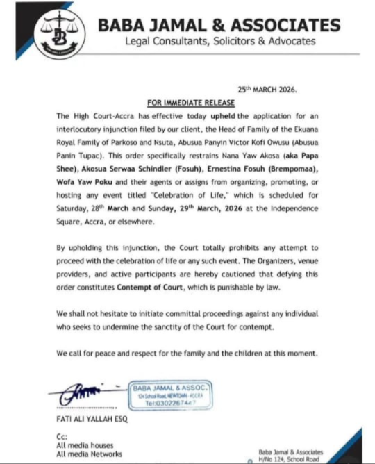 According to a statement from Baba Jamal & Associates, the court order bars Nana Yaw Akosa (Papa Shee), Akosua Serwaa Schindler (Fosuh), Ernestina Fosuh (Brempoma), Wofa Yaw Poku, and their agents from organising, promoting, or hosting the event in any form.