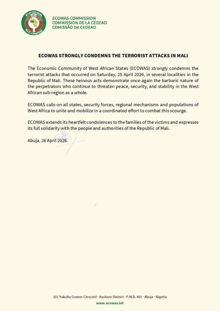 The Economic Community of West African States (ECOWAS) has strongly condemned the series of terrorist attacks that struck multiple locations in the Mali on Saturday, April 25, 2026.