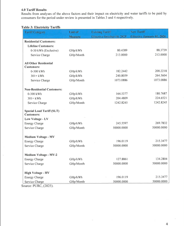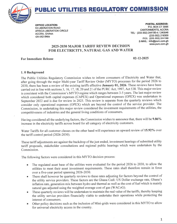 Consumers across Ghana will begin paying higher utility bills from January 1, 2026, as the Public Utilities Regulatory Commission (PURC) announces fresh increases in electricity and water tariffs following its multi-year tariff review for the 2026–2030 period.
