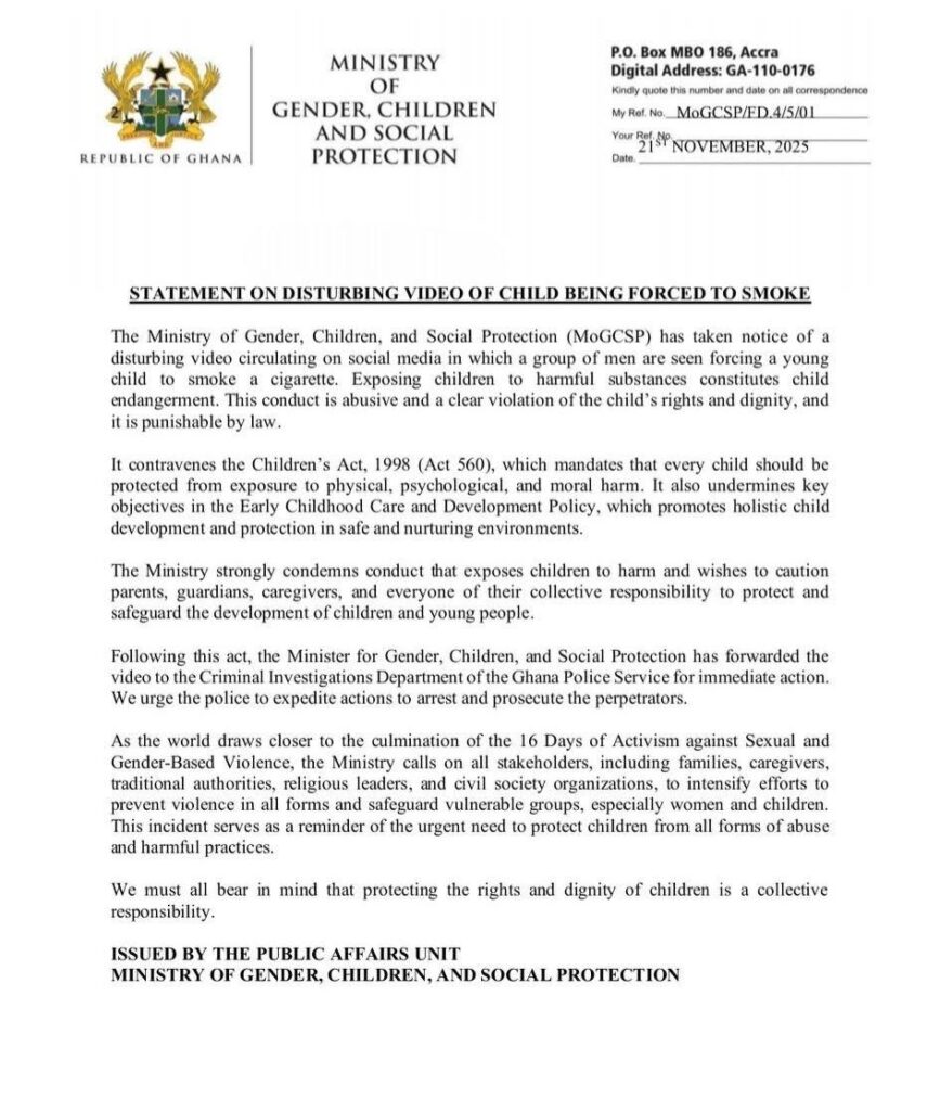 The Ministry of Gender, Children, and Social Protection (MoGCSP) has reported a disturbing video circulating on social media, showing men forcing a young child to smoke, to the Criminal Investigations Department (CID) of the Ghana Police Service for urgent investigation and action.
