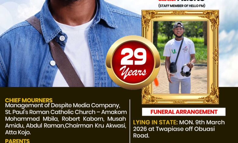 All sympathizers are invited to mourn with the family at his final funeral rites on Tuesday, March 10, 2026 at Twapiase Roman Catholic Church Park, near Obuasi.