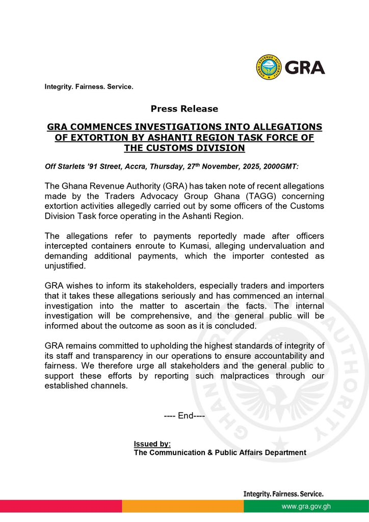 The Ghana Revenue Authority (GRA) has launched an investigation into allegations of extortion by officers of its Customs Division Task Force in the Ashanti Region, following complaints from the Traders Advocacy Group Ghana (TAGG).