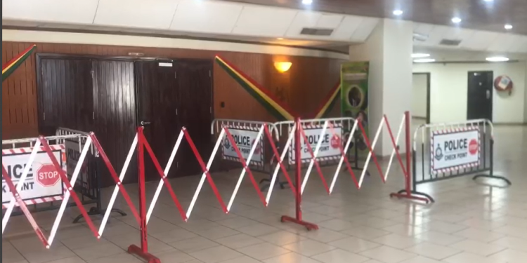As Parliament prepares for its 12:00 noon proceedings, a heavy police presence can be seen, with barricades set up at various sections of the building.