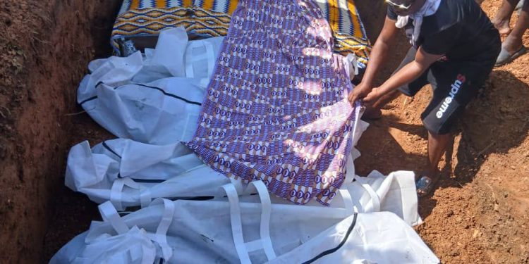 A grieving community in Akyempim, Upper Denkyira East Municipality, Central Region, laid to rest a mother and her six children in a single grave following a devastating fire that claimed their lives on November 1, 2025.