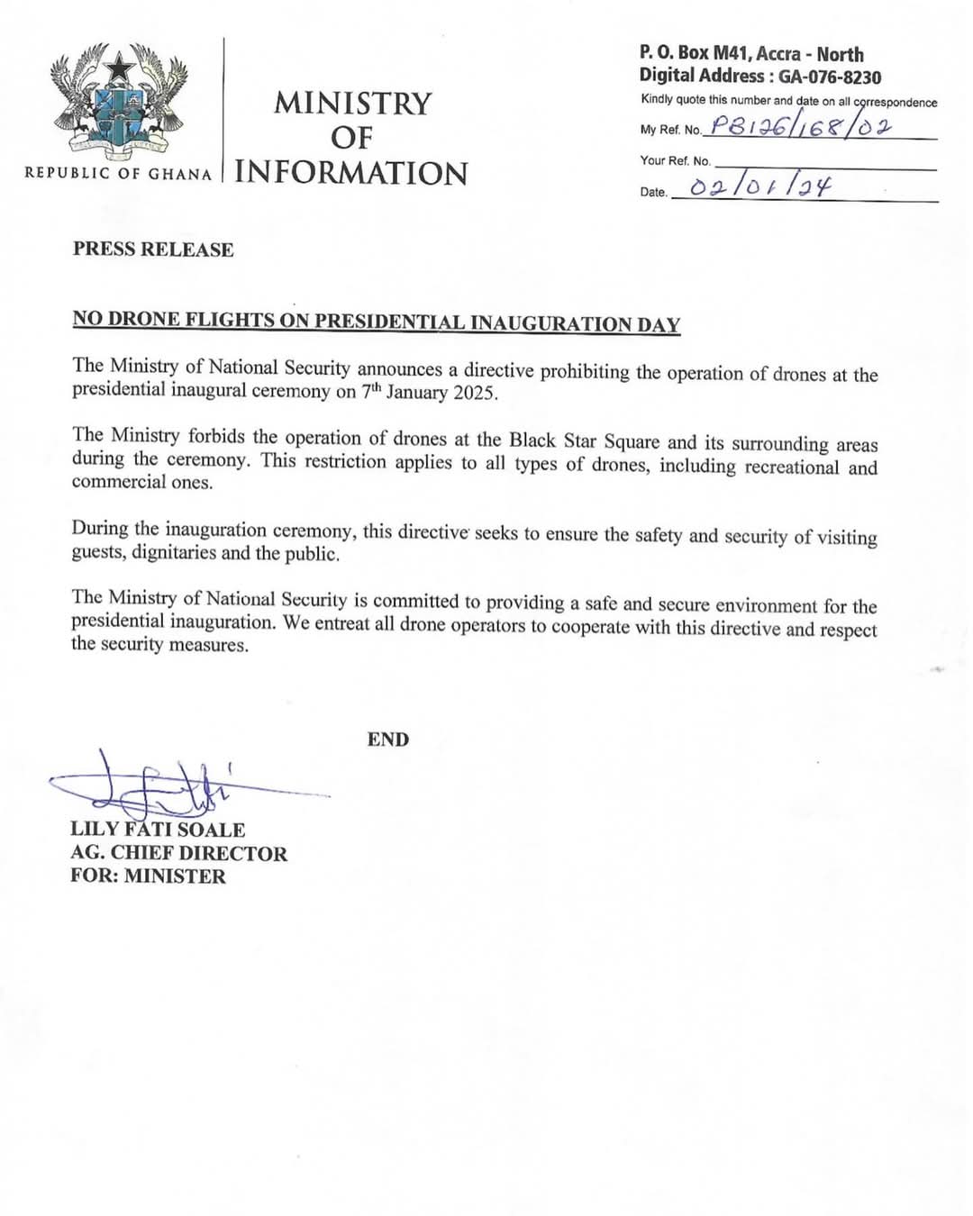 The Ministry of National Security has issued a firm ban on drone flights during the upcoming presidential inauguration set for January 7, 2025.