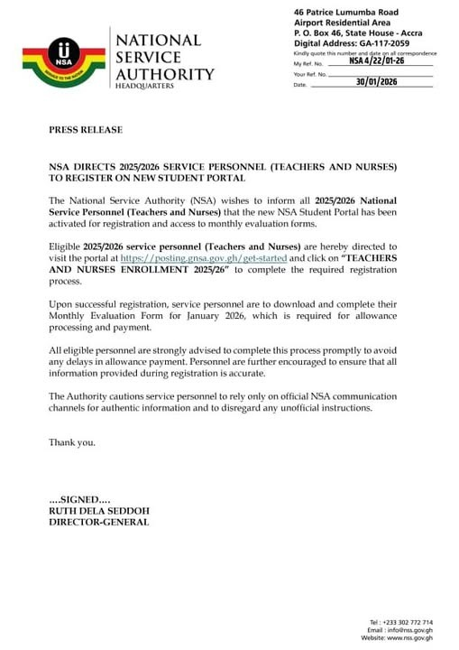 The National Service Authority (NSA) has launched a new Student Portal for the registration of 2025/2026 National Service Personnel in the teaching and nursing categories.