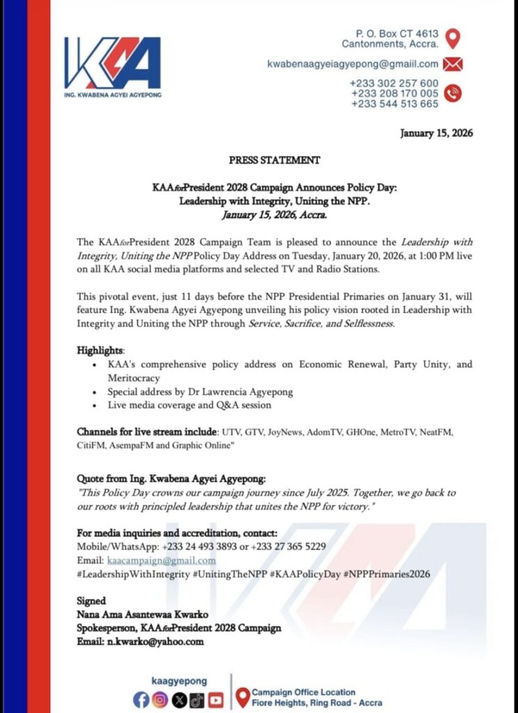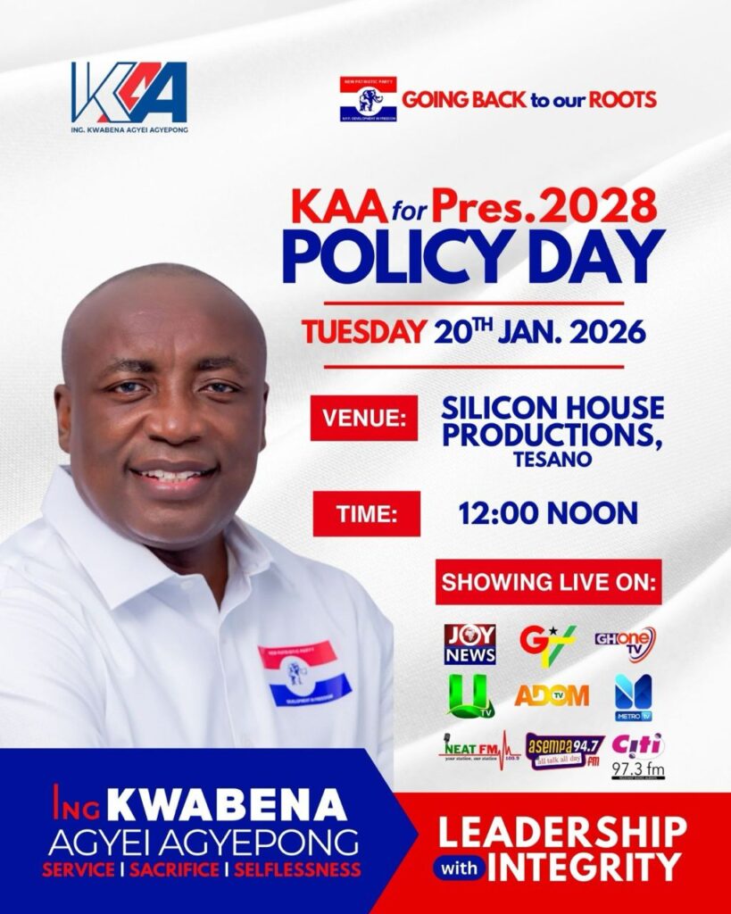 The Ing. Kwabena Agyei Agyepong for President 2028 Campaign Team has officially announced a Policy Day Address by Ing. Kwabena Agyei Agyepong, slated for Tuesday, January 20, 2026, at 1:00 PM, as the New Patriotic Party (NPP) gears up for its presidential primaries on January 31.