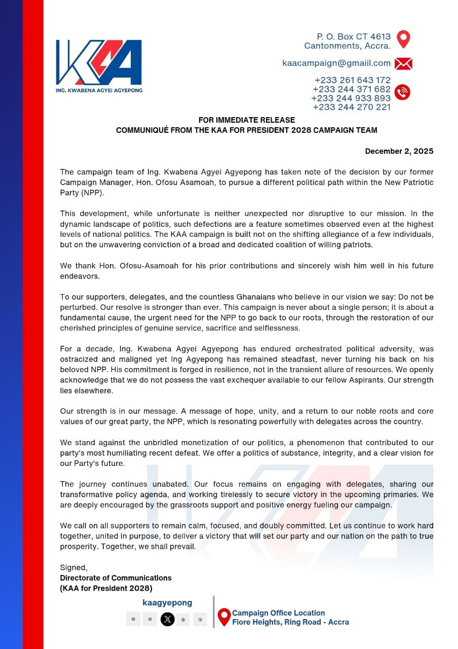 The campaign team of Ing. Kwabena Agyei Agyepong has dismissed concerns over the defection of its former Campaign Manager, Hon. Ofosu-Asamoah, to the camp of former Vice President Mahamudu Bawumia, describing the development as “unfortunate but not disruptive.”
