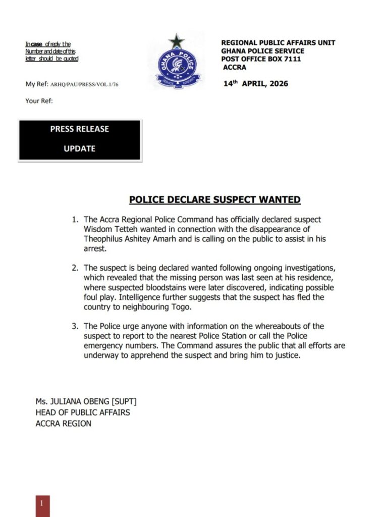 The Accra Regional Police Command has declared one Wisdom Tetteh wanted in connection with the disappearance of Theophilus Ashitey Amarh, amid indications of suspected foul play.