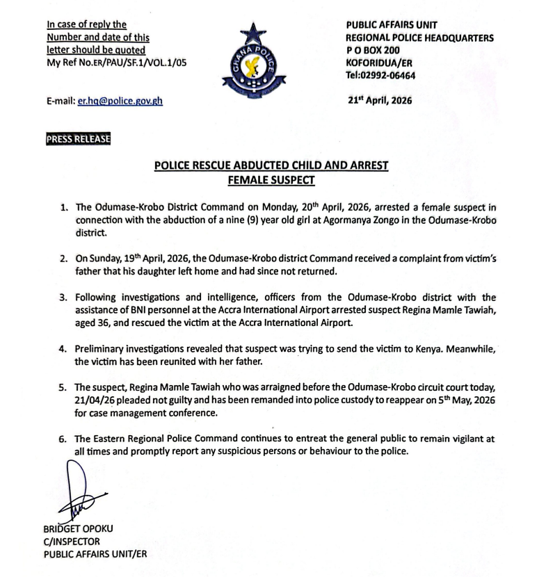 The Ghana Police Service has rescued a nine-year-old girl who was allegedly abducted in Agormanya Zongo in the Eastern Region and arrested a suspect linked to the case.