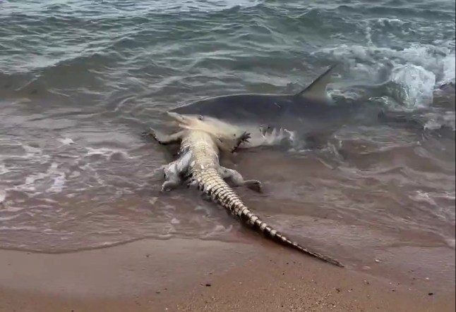Footage captured by two women shows the lifeless crocodile floating belly-up near the shoreline as the shark emerges from the water. With a powerful grip, the shark snaps the crocodile’s head clean off, dragging its meal beneath the waves as the tide churns on.