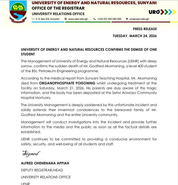 The University of Energy and Natural Resources (UENR) has confirmed the death of one of its students, Mr. Godfred Akomaning.