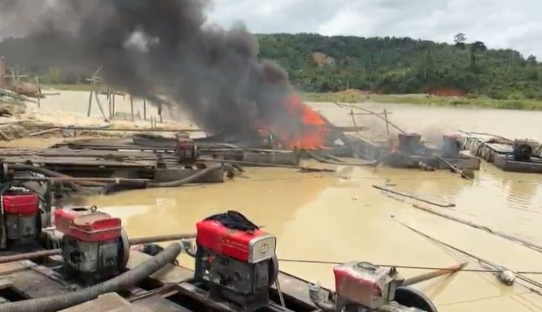 Destroyed equipment at the site included 20 water pumping machines, 15 changfan units, industrial hoses, gold washing platforms, and multiple makeshift shelters used as living quarters. The shelters were also burned to prevent reuse.