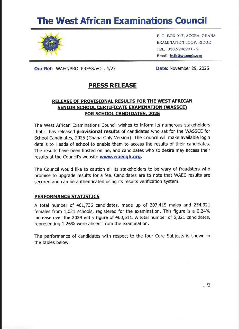 According to a statement issued on November 29, 2025, the results have been uploaded online, and candidates may access them through the Council’s website, www.waecgh.org. Heads of schools have also been provided with login details to check results for their candidates.
